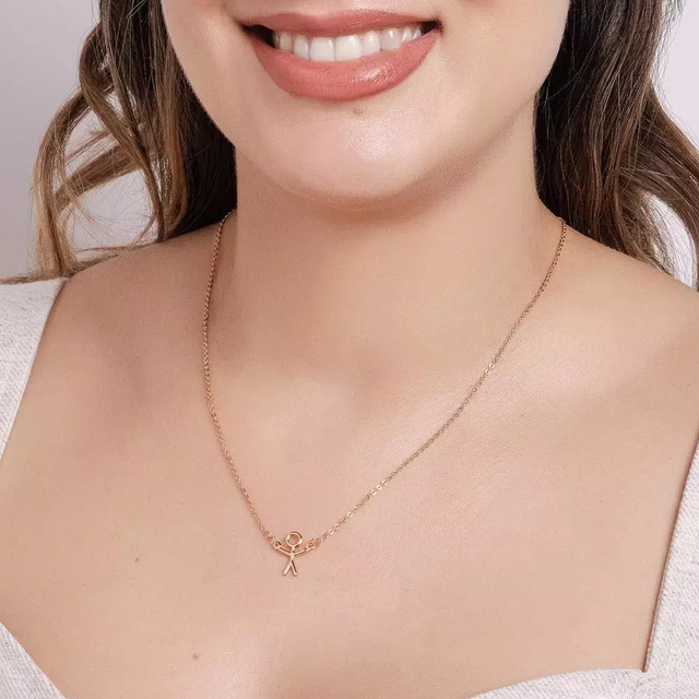 Gargantilha formada por corrente de elos cadeado laminado fio 0,35 mm, composta por pingente menino palito.