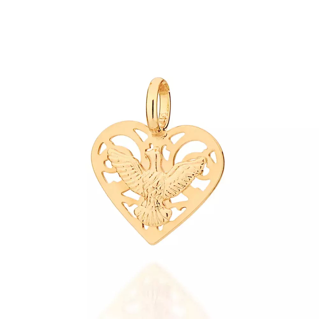 Pingente formato coração com espírito santo ao centro. med 1,7 cm x 1,3 cm